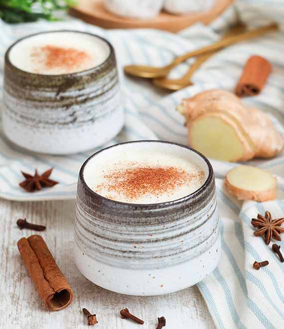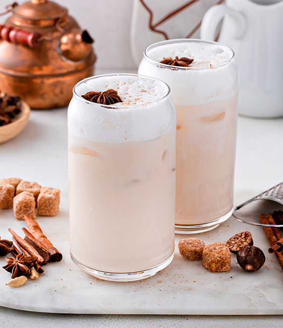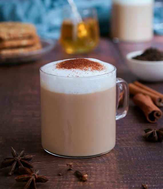 Esta receta cuidadosamente elaborada comienza con una infusión de jengibre, agua y nuez moscada para capturar todos los sabores. La leche se espuma con esmero para lograr una textura cremosa y sedosa.
